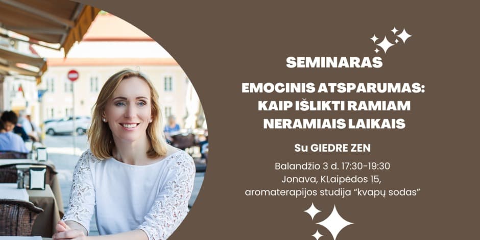 Bet galiu pažadėti, kad iš seminaro išeisite su visai kitu nusiteikimu nugyventi dar vieną gyvenimo dieną ne nuolat nerimaujant ir taip "valgant" save ir savo sveikatą iš vidaus, o mylint ir gebant atrasti prasmę ir džiaugsmą mažuose dalykuose.